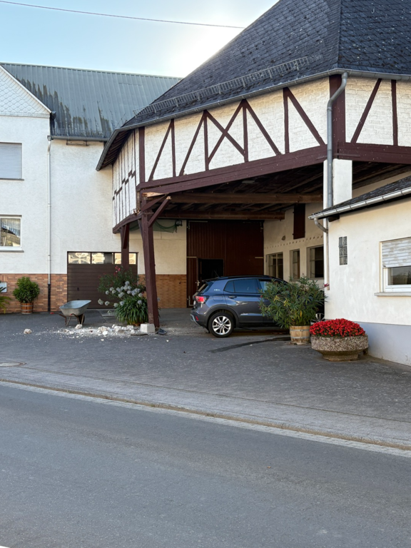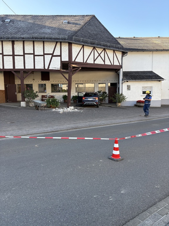 Person mehr im Fahrzeug befindet, diese aber nach der Kollision mit dem Traktor in eine Fachwerkscheune gefahren war. Dabei wurde ein tragender Pfeiler beschädigt und in Folge dessen das Gebäude als